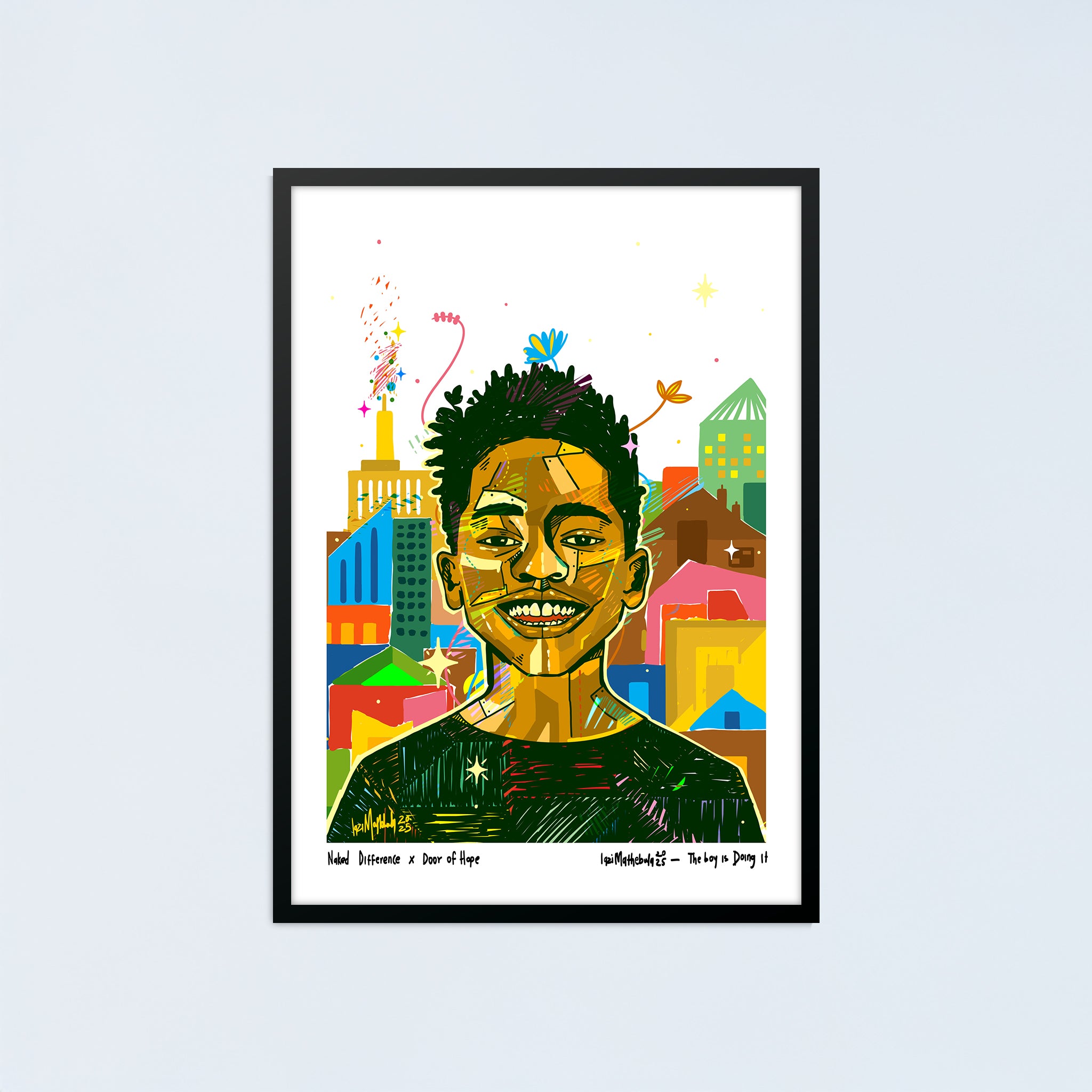 Bring home Lazi Mathebula’s bold, joyful artwork created in collaboration with the Naked Difference for Door of Hope, who care for abandoned babies and find them forever families.