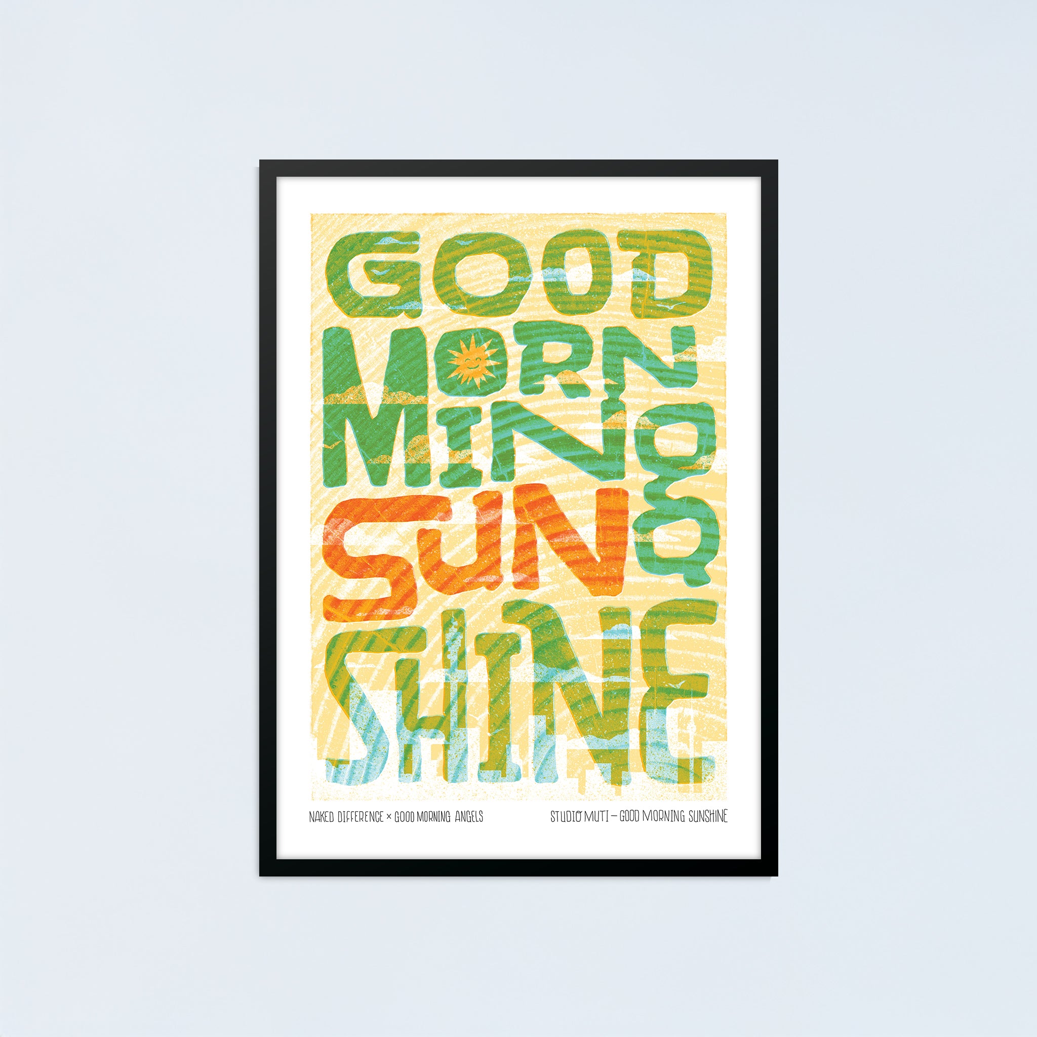 Let optimism set the tone. Studio Muti partnered with the Naked Difference to create this radiant print, symbolising the hope and positivity Good Morning Angels brings to communities through hand-drawn textures that add depth and warmth.
